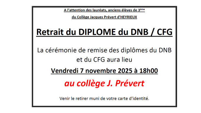 La remise des diplômes du DNB et CFG aura lieu vendredi 7 novembre à 18h00 au collège d’Heyrieux.